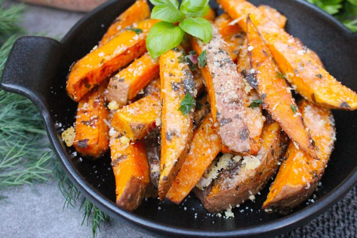 Acești cartofi dulci devin aurii și ușor crocanți la exterior, cu o notă exotică adusă de coriandru și o ușoară iuțeală de la fulgii de chili.