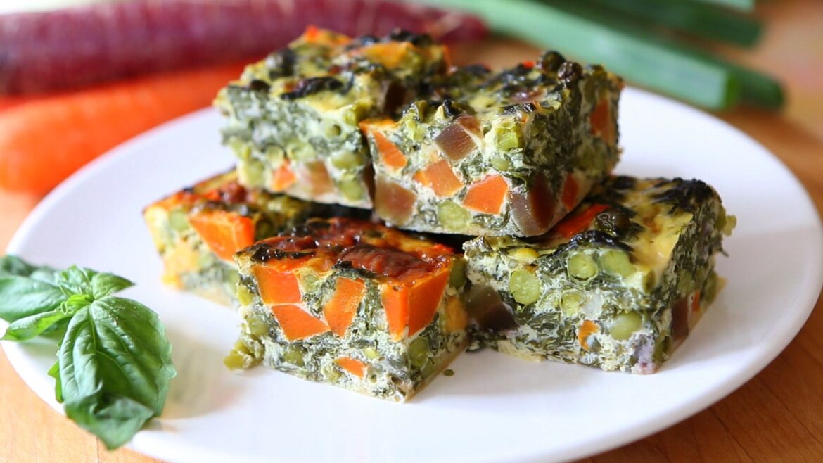 Tapetați o formă de copt de 14×22 cm cu hârtie de copt, pe care o umeziți și o stoarceți bine înainte. Așezați amestecul de legume în formă, nivelând stratul. Turnați deasupra compoziția lichidă cu ouă, făină și lapte, asigurându-vă că ajunge uniform printre legume. - Coacerea: