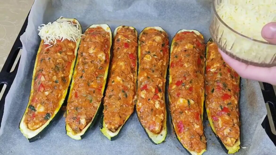 Taie dovleceii pe lung și scobește miezul. Fierbe orezul pe jumătate. Călește ceapa, morcovul ras și ardeiul cubulețe. Adaugă orezul și condimentează. Umple dovleceii cu acest amestec și coace 25-30 de minute la 180°C.
