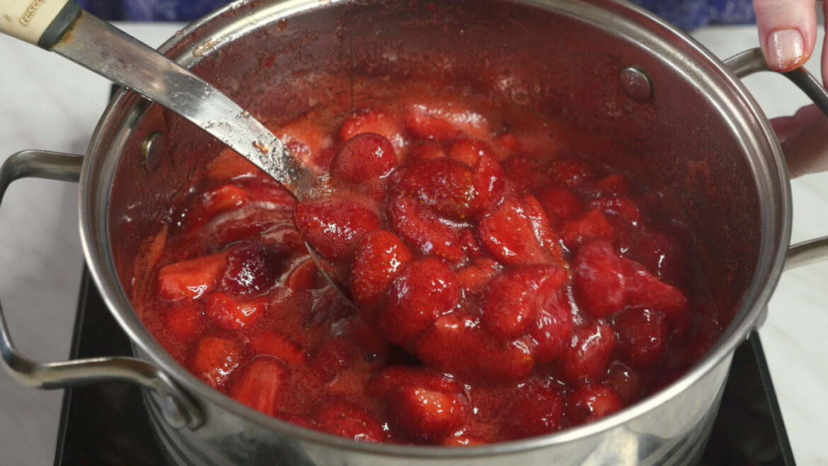 După ce căpșunile au lăsat suficient suc, pune vasul pe foc mediu și adu amestecul la punctul de fierbere. Amestecă ocazional pentru a preveni lipirea de fundul vasului. În timpul fierberii, îndepărtează spuma care se formează la suprafață, astfel încât dulceața să fie limpede și fără impurități. - Reducerea și verificarea consistenței: