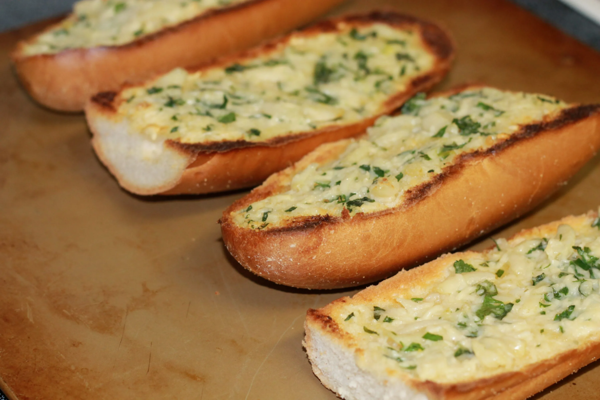 - Coacerea pâinii: Împachetează fiecare jumătate de pâine într-o folie de aluminiu și pune-le într-o tavă. Coace-le în cuptorul preîncălzit la 200°C timp de 10 minute.