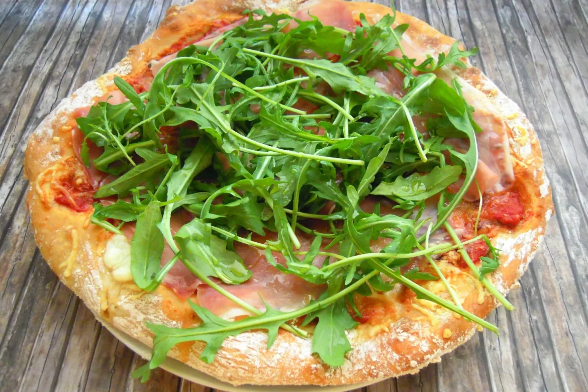 - Scoate pizza din cuptor și, cât este încă fierbinte, așază feliile de șuncă crud-uscată peste ea. Rucola se adaugă deasupra în stare proaspătă, imediat înainte de servire, pentru a-și păstra prospețimea și textura ușor crocantă.