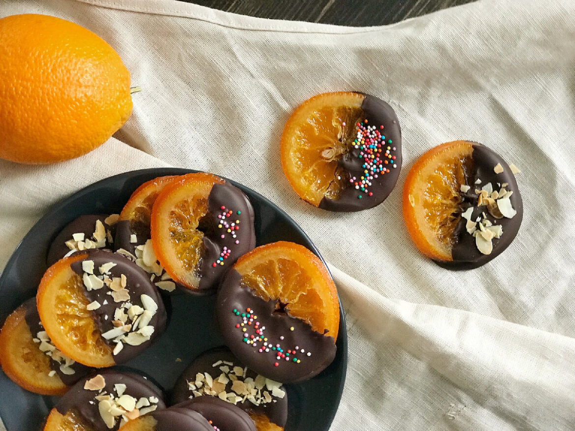 - Împachetarea portocalelor: Îmbibați fiecare felie de portocală în ciocolată topită, lăsând o parte neacoperită. Presărați fulgi de cocos și decoruri pentru prăjituri deasupra.