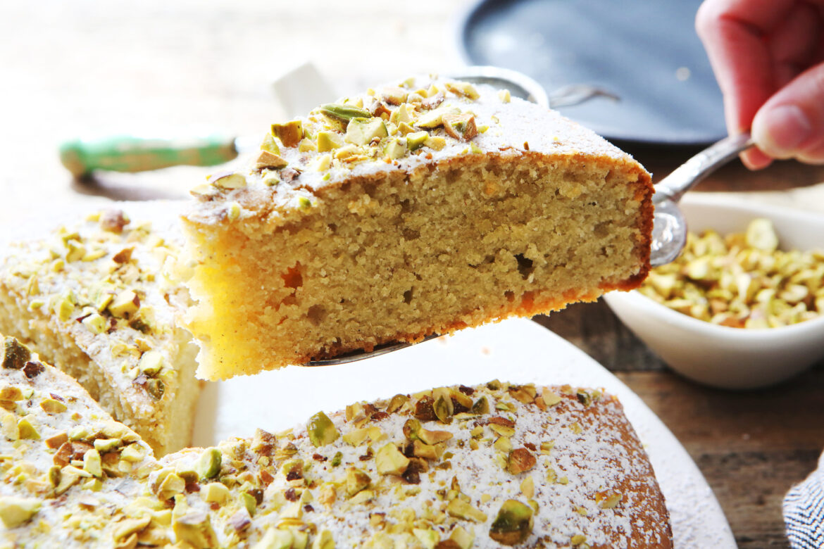 - Lasă prăjitura să se răcească timp de cel puțin 10 minute înainte de a o răsturna pe un grătar de răcire. Când este complet răcită, pudrează-o cu zahăr pudră și presară fistic zdrobit deasupra pentru un aspect frumos și un gust suplimentar.