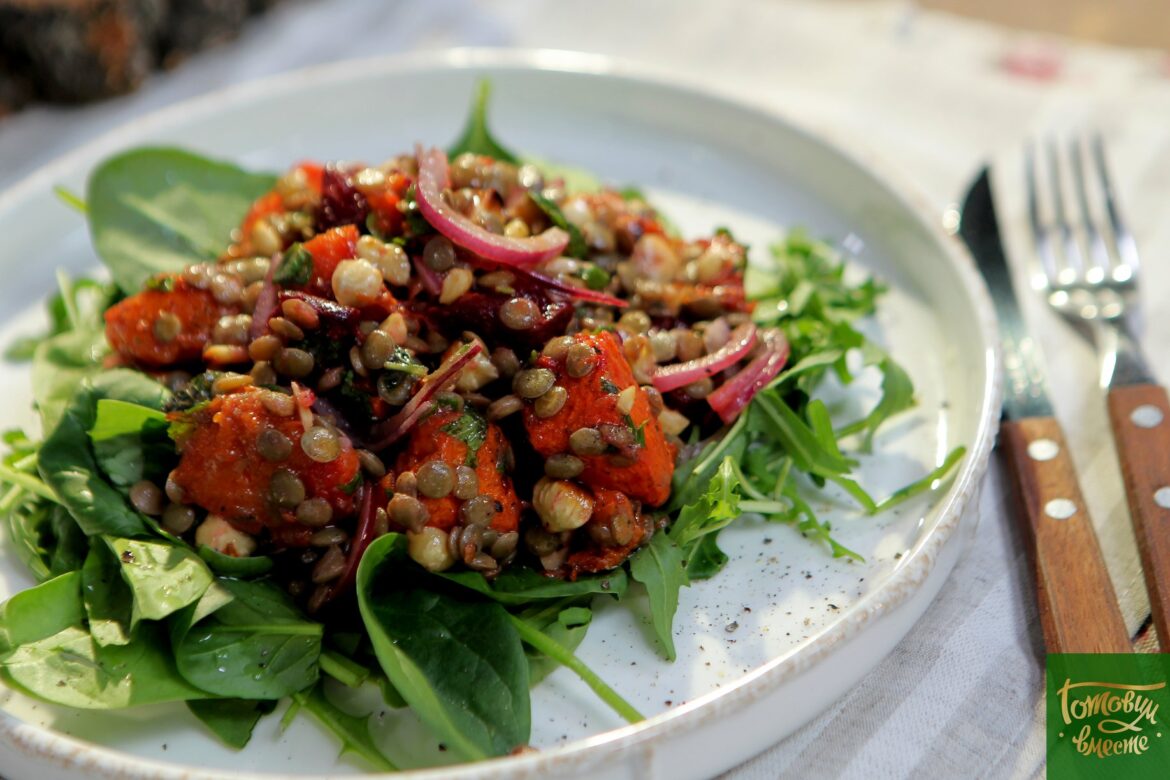 Această salată călduță este sățioasă și are o aromă bogată. Lintea roșie este moale, iar ceapa caramelizată adaugă dulceață naturală.