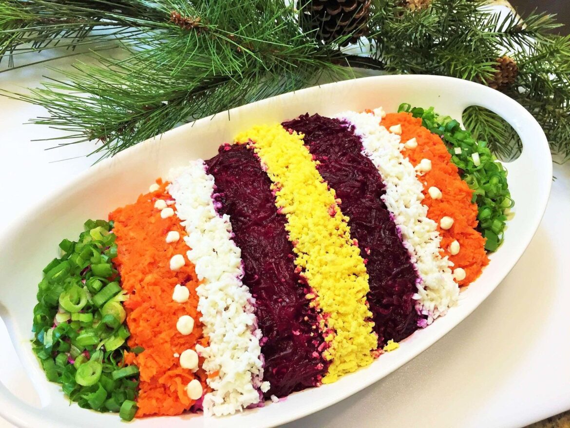 - Pentru un decor final spectaculos, presară gălbenușuri mărunțite, semințe de rodie, morcov ras și ceapă verde pe marginea salatei.