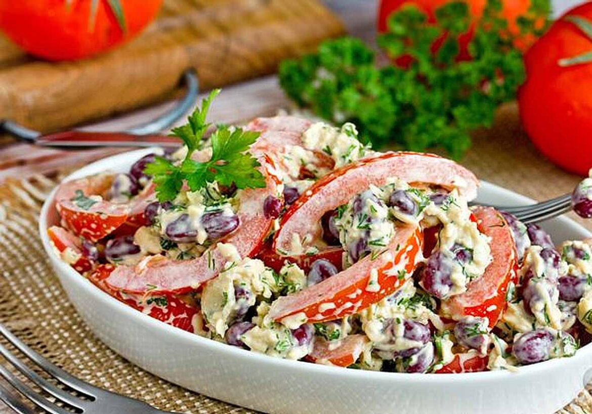 - Prepararea salatei: Într-un bol mare, adăugați fasolea fiartă, morcovii rași, roșiile cherry tăiate și ceapa roșie. Amestecați ușor pentru a distribui uniform ingredientele.