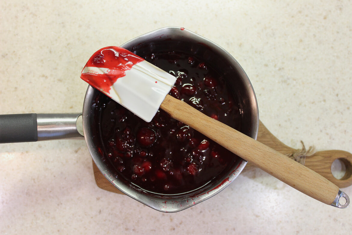 După ce siropul a ajuns la punctul de fierbere, adaugă merișoarele. Lasă-le să fiarbă, iar când încep să pocnească (aproximativ după 5-7 minute), reduce focul la mic și fierbe compoziția pentru încă 10 minute, amestecând ocazional. - Adăugarea aromelor